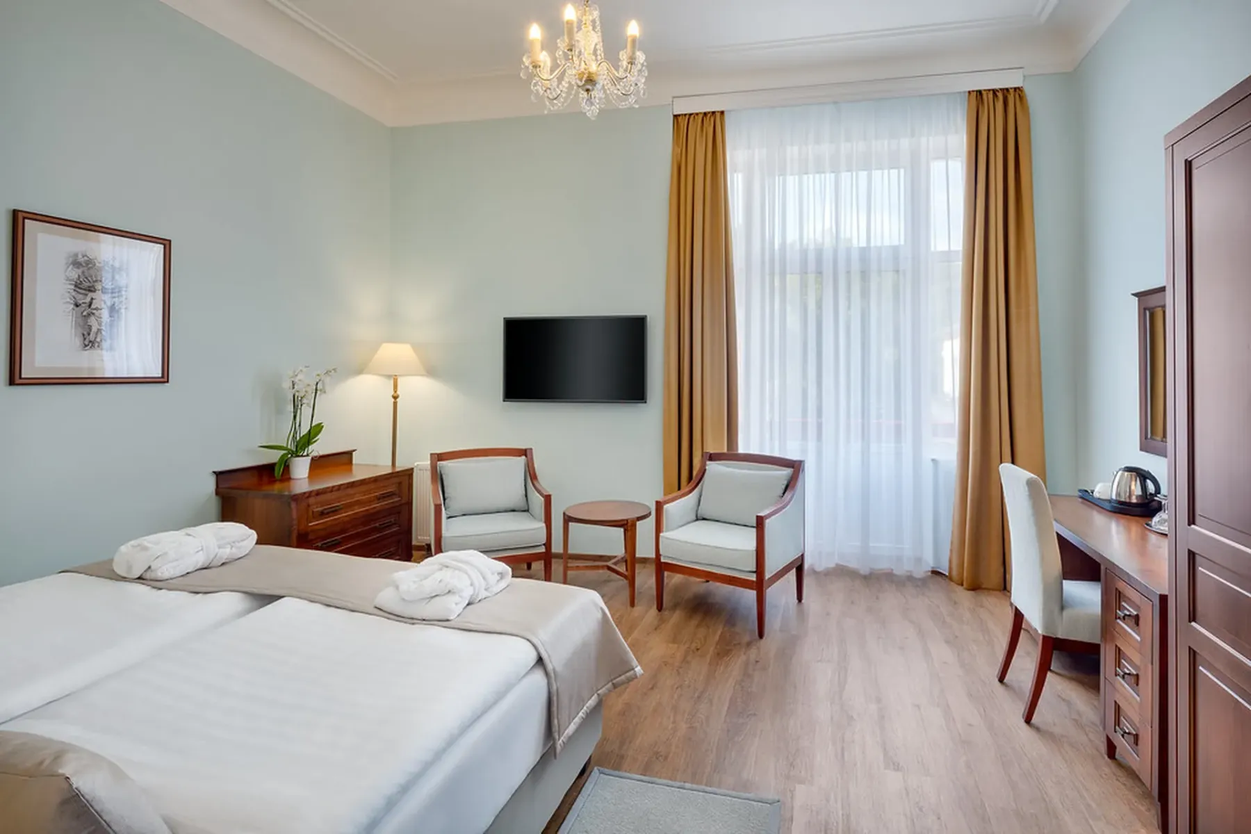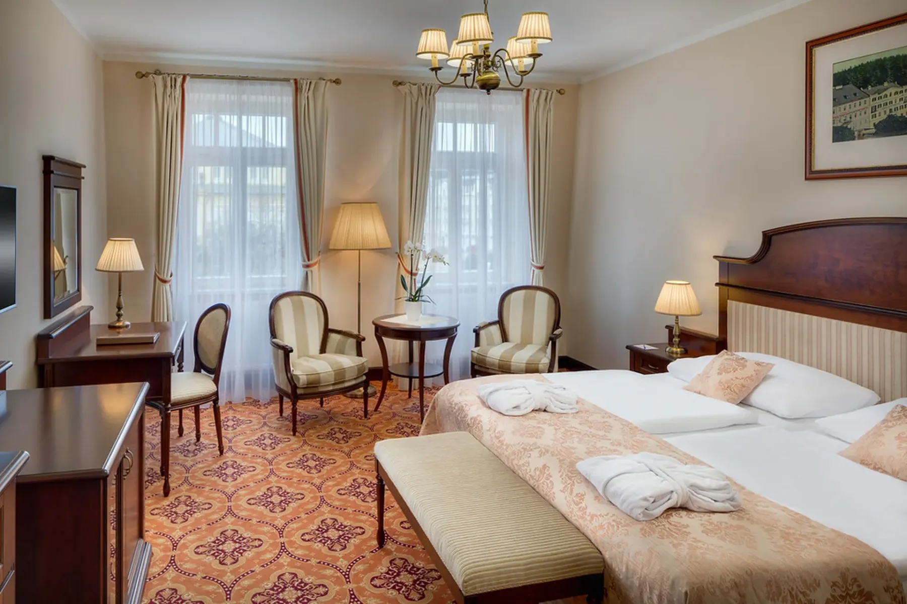 Perched on Goethe Square and surrounded by Mariánské Lázně’s spa quarter, Hotel Hvězda Imperiál melds historic grandeur with modern comfort. It’s just steps away from the town’s iconic colonnades and mineral springs