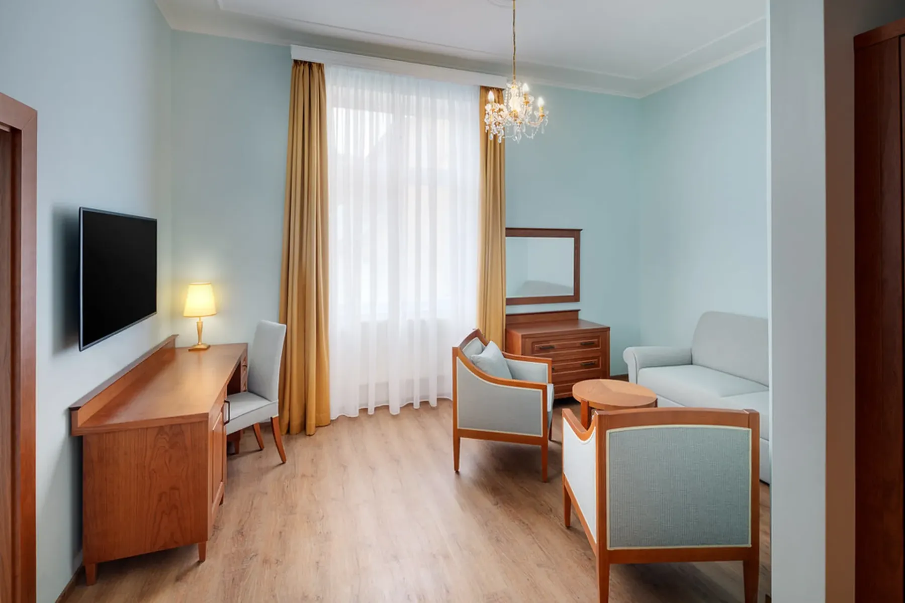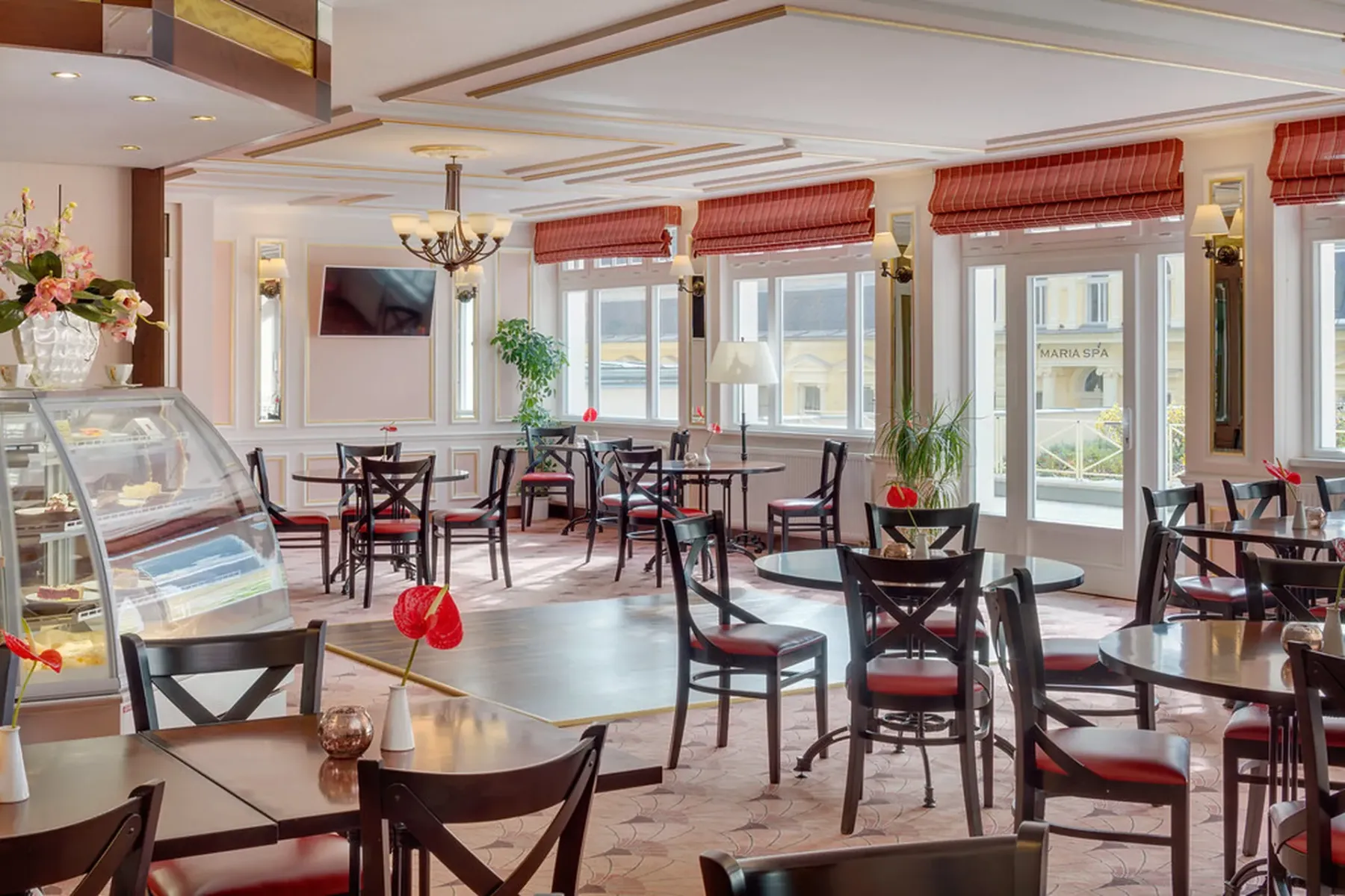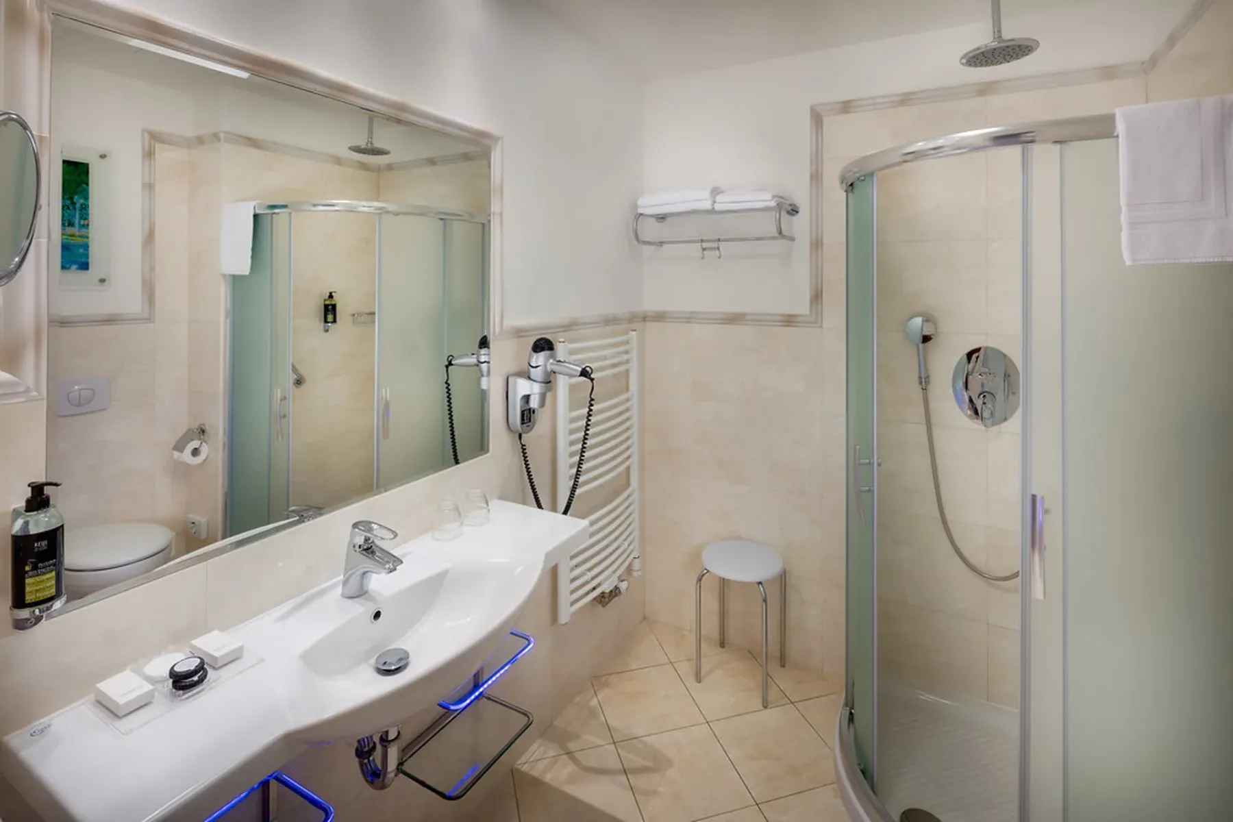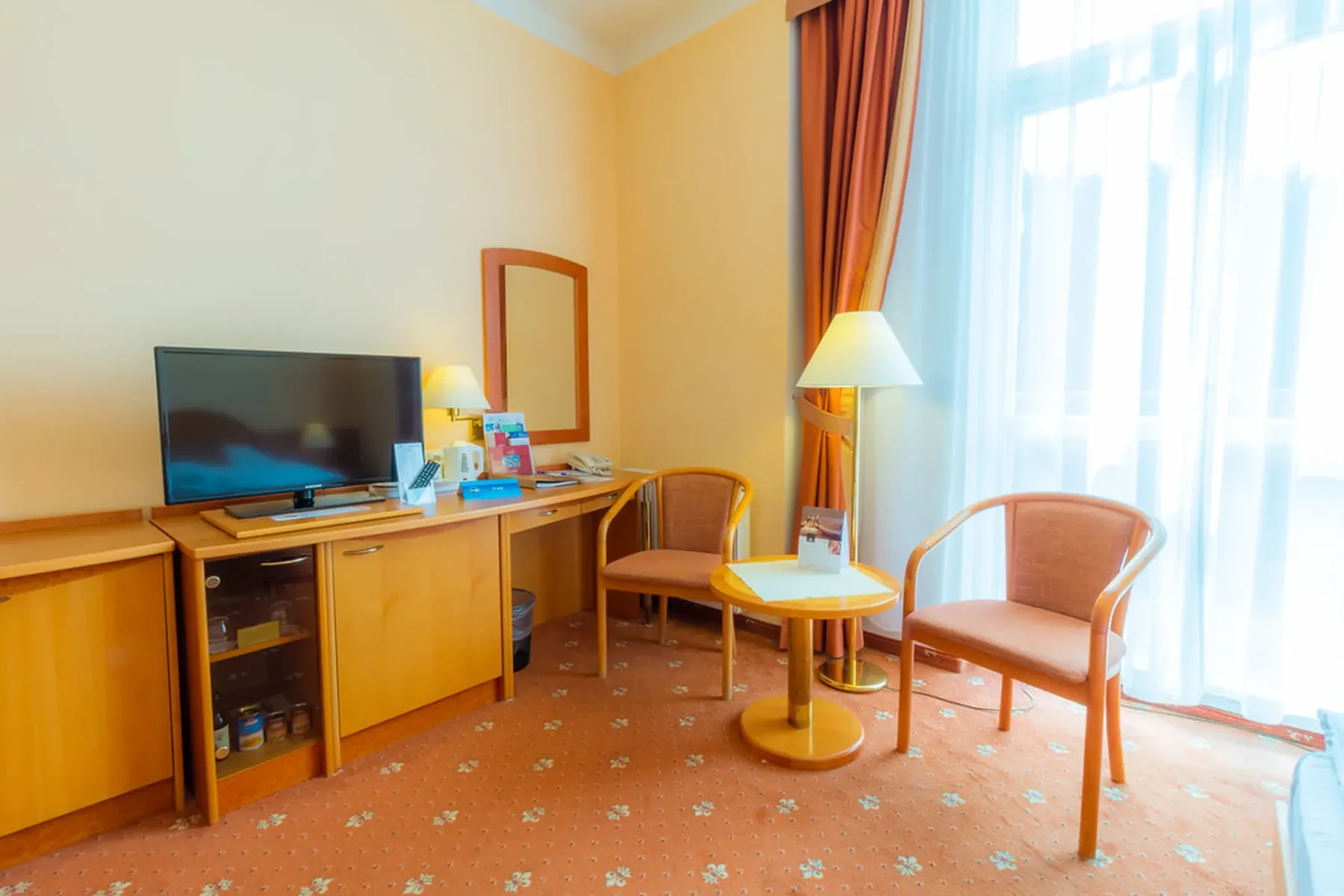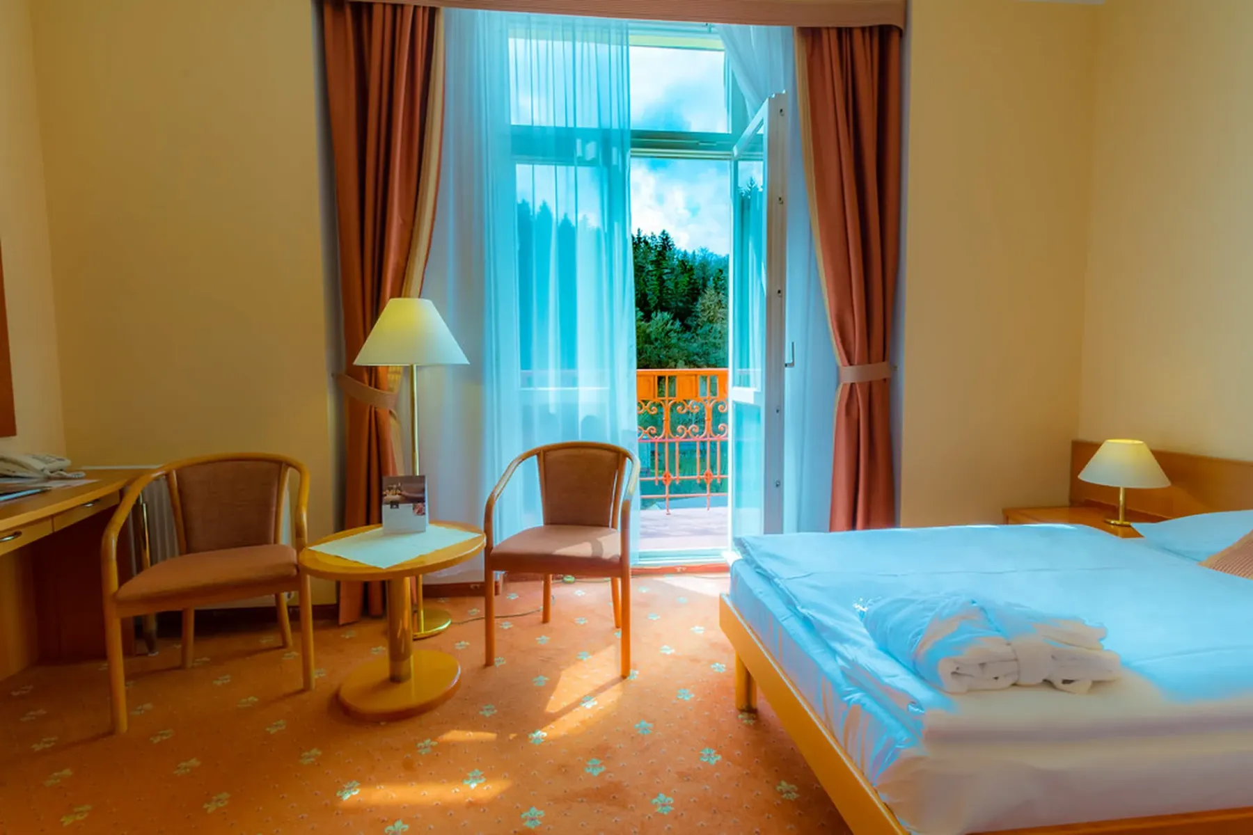 The hotel has over 30 treatment rooms, connected to Hvězda and Neapol by heated indoor corridors. It offers a blend of modern medicine and natural resources such as mineral water, peat, and CO₂ therapy. Services range from balneotherapy and physiotherapy to advanced treatments like BioCon-2000W for urological and pelvic health. Therapies are scheduled for maximum comfort and efficiency.