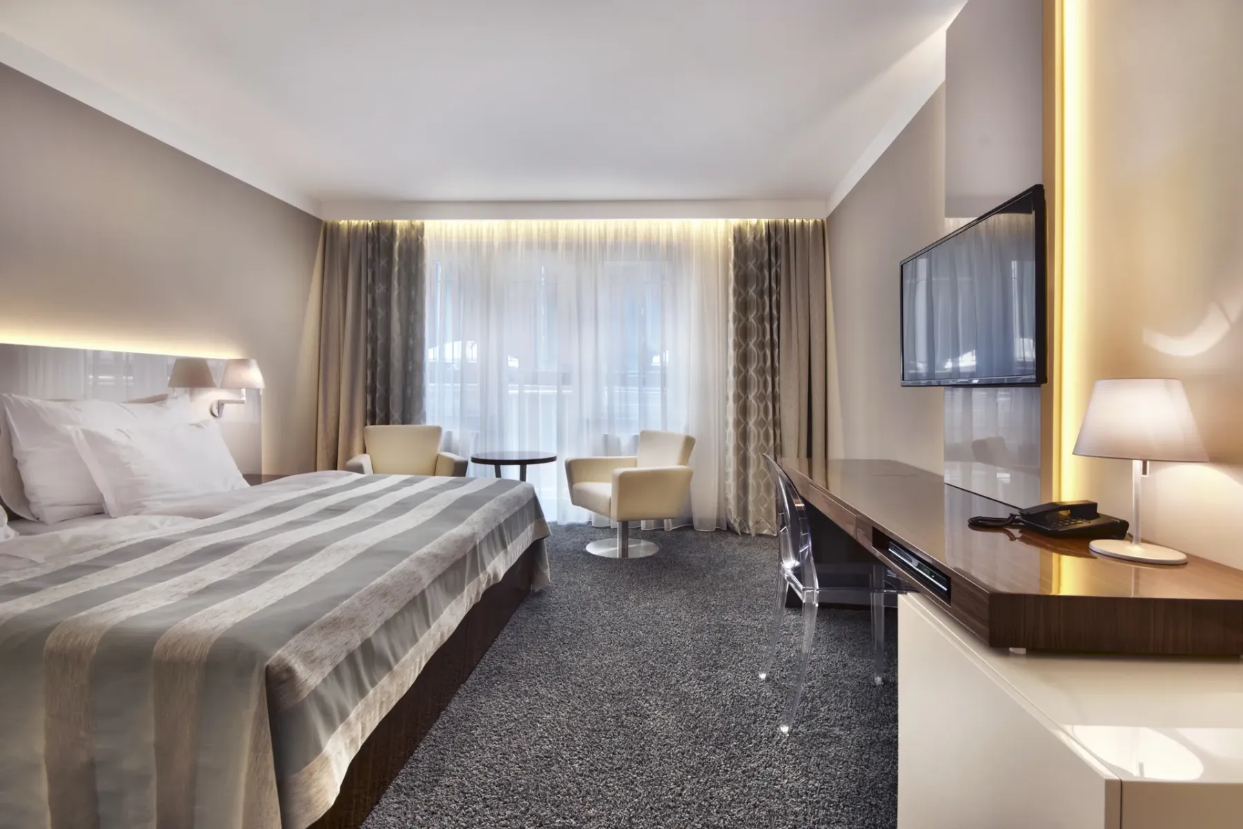Up to date equipped and spacious rooms and suites offer all possible comfort. High speed Internet is available in the rooms and throughout the hotel free of chargé via Wi-Fi and LAN.